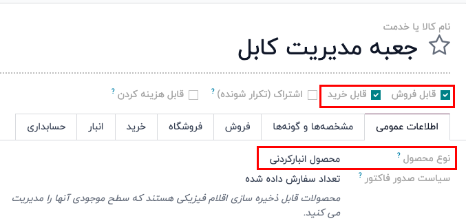سپس در فرم محصول، با انتخاب گزینه "قابل خرید" زیر فیلد نام محصول، قابلیت سفارش مجدد را فعال کنید. در نهایت، نوع محصول را در تب اطلاعات عمومی به "محصول قابل ذخیره" تنظیم کنید.
