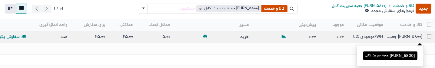 برای برخی از محصولات، لازم است همیشه حداقل مقداری از آنها در دسترس باشد. با اضافه کردن قانون سفارش مجدد به یک محصول، میتوان فرآیند سفارشگذاری را به صورت خودکار انجام داد، بهطوری که هر زمان موجودی انبار از یک حد تعیینشده کمتر شد، سفارش خرید بهصورت خودکار ایجاد شود.