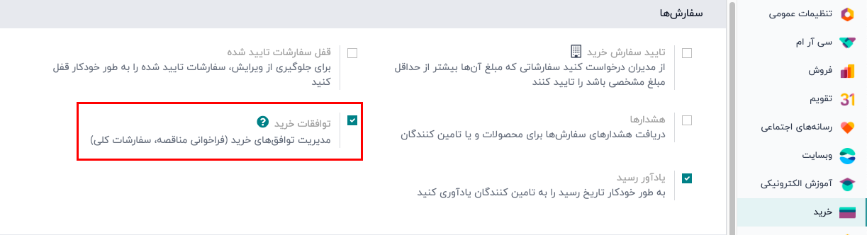 برای ایجاد سفارشهای جامع، ویژگی "توافقنامههای خرید" را از تنظیمات برنامه خرید فعال کنید. به برنامه خرید ‣ پیکربندی ‣ تنظیمات بروید و در بخش سفارشها، گزینه "توافقنامههای خرید" را تیک بزنید. سپس برای اعمال تغییرات روی "ذخیره" کلیک کنید.