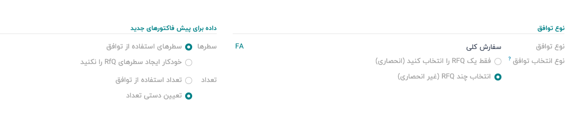 - انتخاب چندین پیش فاکتور (غیر انحصاری): وقتی یک سفارش خرید تأیید میشود، سایر سفارشهای خرید لغو نمیشوند و چندین سفارش خرید مجاز هستند.