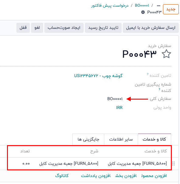 پس از تأیید یک سفارش کلی، یک خط تأمینکننده جدید در زیر تب خرید کالا و خدمت موجود در سفارش اضافه میشود.