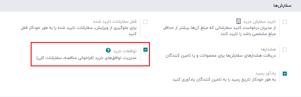 - در بخش سفارشات، تیک گزینه توافقات خرید را بزنید.