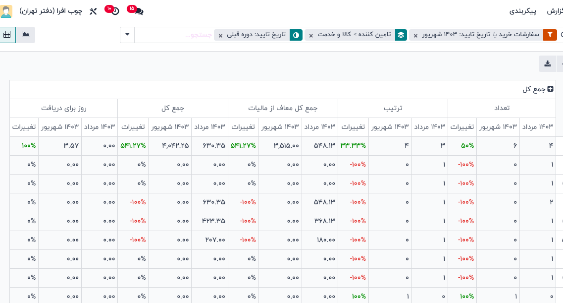 با استفاده از برنامه خرید، کاربران میتوانند نوسانات هزینههای تأمینکنندگان را در طول زمان پیگیری کنند. این قابلیت به کاربران امکان میدهد تا تأمینکنندگان با هزینههای بالاتر را شناسایی کنند و تغییرات فصلی را دنبال کنند.