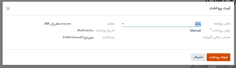 با این کار یک پنجره پاپآپ "ثبت پرداخت" ظاهر میشود که در آن میتوانید یک ژورنال پرداخت انتخاب کرده و روش پرداخت را تعیین کنید.