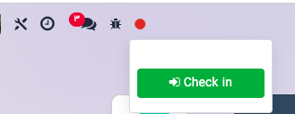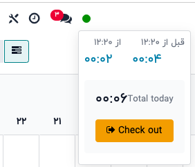 اگر دایره ویجت حضور و غیاب قرمز باشد، نشاندهنده این است که کاربر در حال حاضر ورود خود را ثبت نکرده است. با کلیک بر روی دایره قرمز 🔴، ویجت حضور و غیاب ظاهر میشود و دکمه سبز "Check in" نمایش داده میشود.