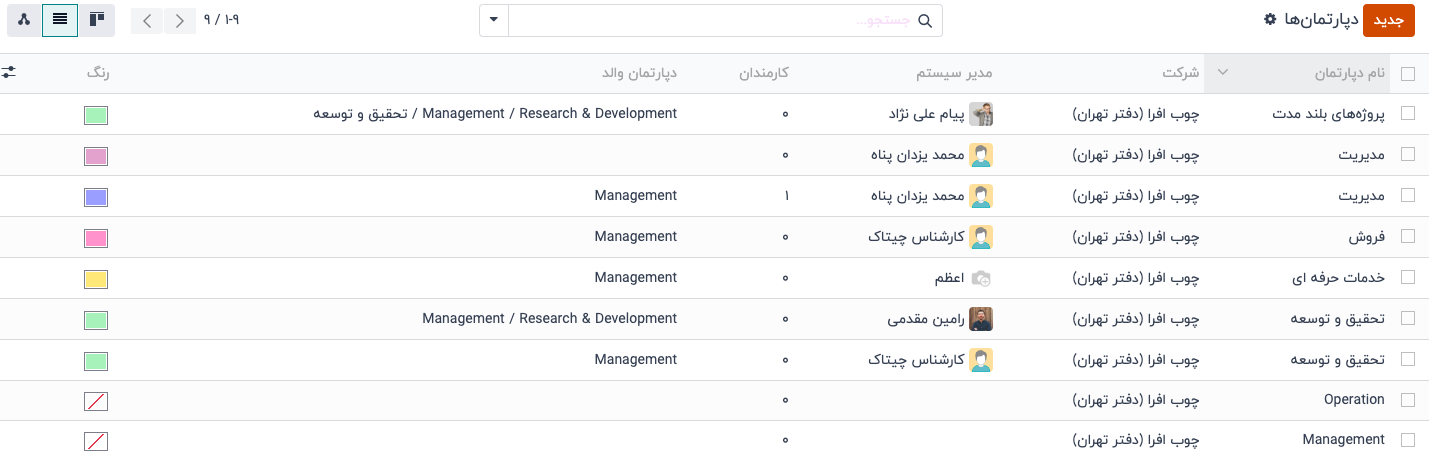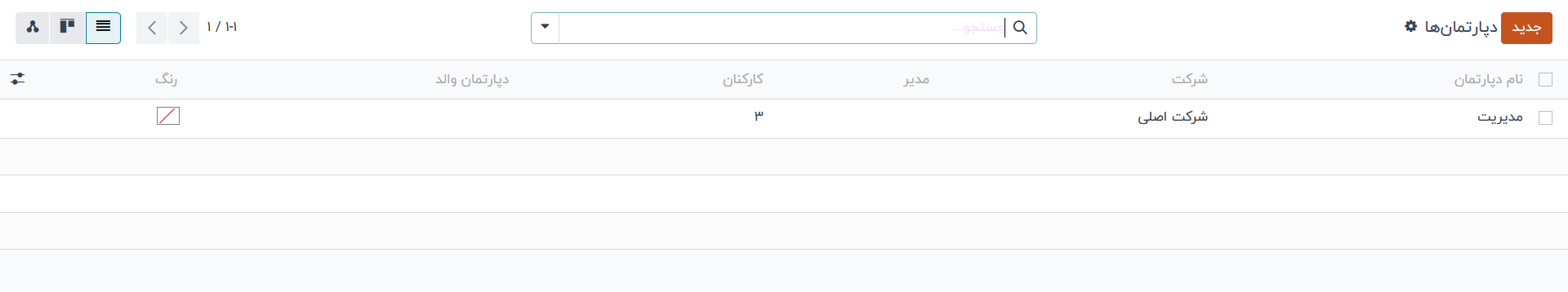 برای مشاهده دپارتمانها در نمای لیست، روی آیکون (لیست) در گوشه بالا-چپ کلیک کنید. دپارتمانها در یک نمای لیست نمایش داده میشوند که شامل نام دپارتمان، شرکت، مدیر، کارمندان، دپارتمان اصلی و رنگ برای هر دپارتمان است.