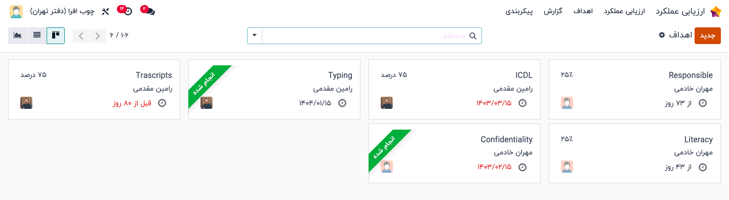 برای مشاهده همه اهداف، به برنامه ارزیابیعملکرد ‣ اهداف بروید. این بخش تمام اهداف هر کارمند را در نمای پیشفرض کانبان نمایش میدهد.