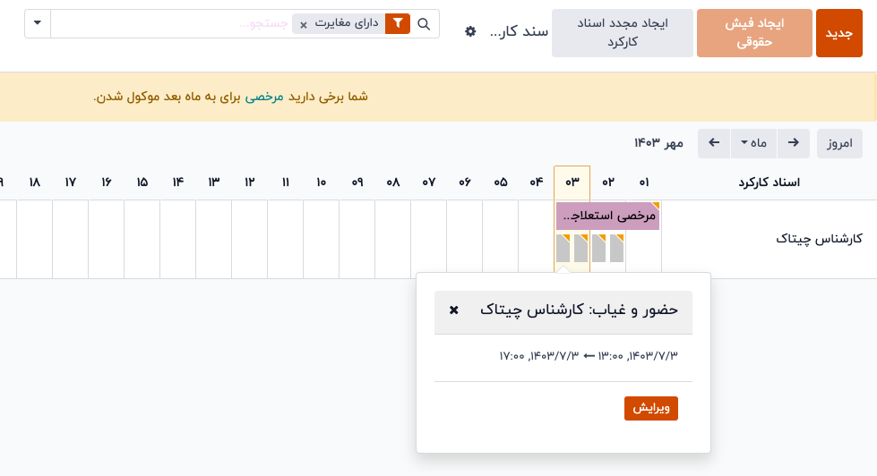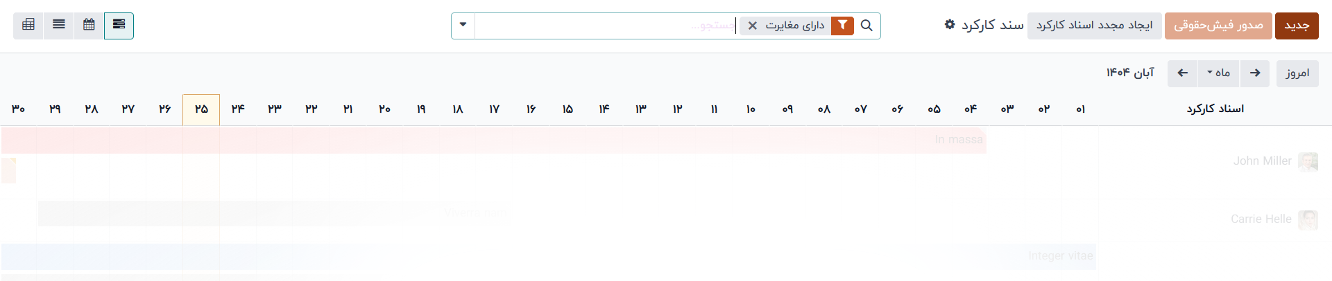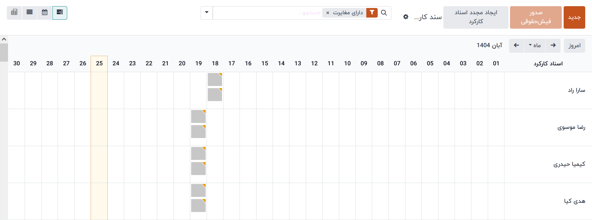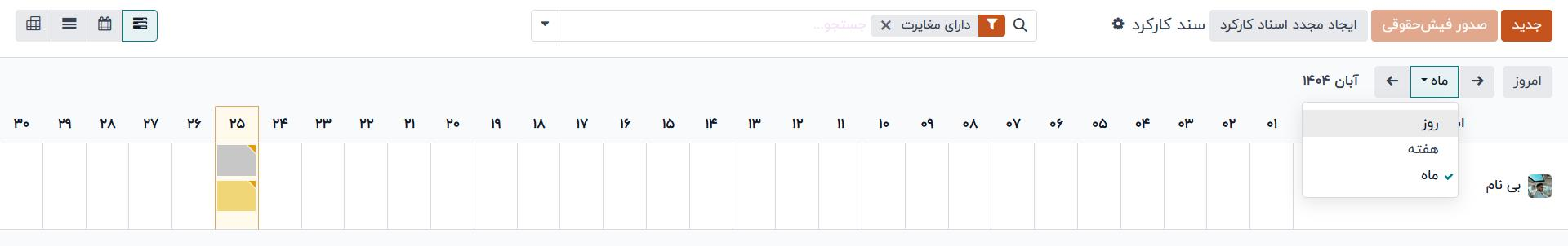 در داشبورد اسناد کارکرد، اسناد کارکرد کل ماه نمایش داده میشود و روز جاری به رنگ زرد روشن هایلایت میشود.