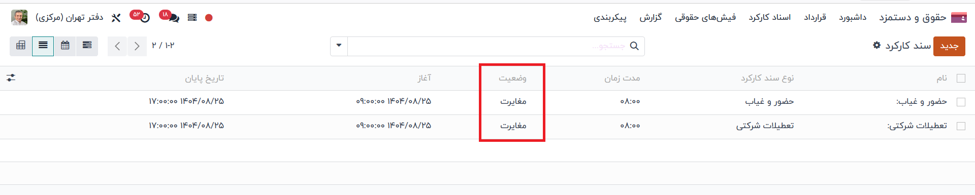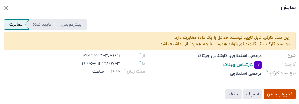 اگر مغایرت ناشی از درخواستی برای مرخصی باشد که هنوز تأیید نشده است، یک فیلد مرخصی در سمت راست ظاهر میشود که نوع مرخصی درخواست شده را در توضیحات نشان میدهد.