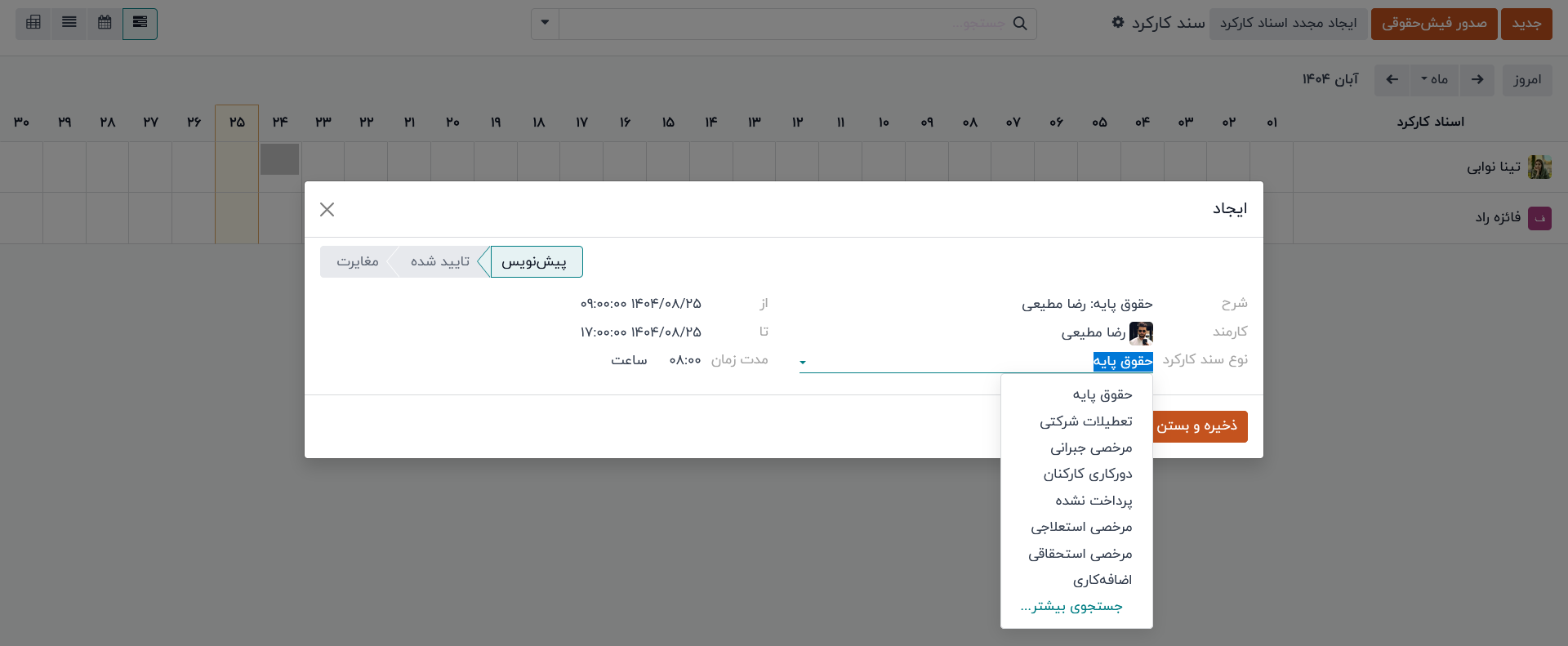 اگر سند کارکردی مفقود شده و نیاز به اضافه کردن آن است، مانند مرخصی استعلاجی، یا اگر کارمندی فراموش کرده است که ورود و خروج شیفت خود را ثبت کند، روی دکمه جدید در داشبورد اسناد کارکرد کلیک کنید تا فرم پاپآپ برای ایجاد سند کارکرد ظاهر و یک سند کارکرد جدید ایجاد شود.