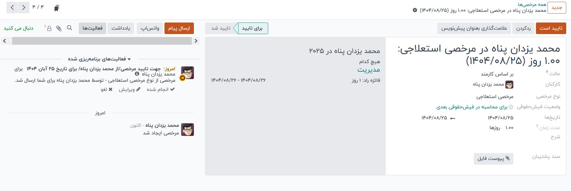 اگر تأیید اشتباه بود، میتوان با کلیک بر روی دکمه رد مرخصی درخواست را رد کرد.