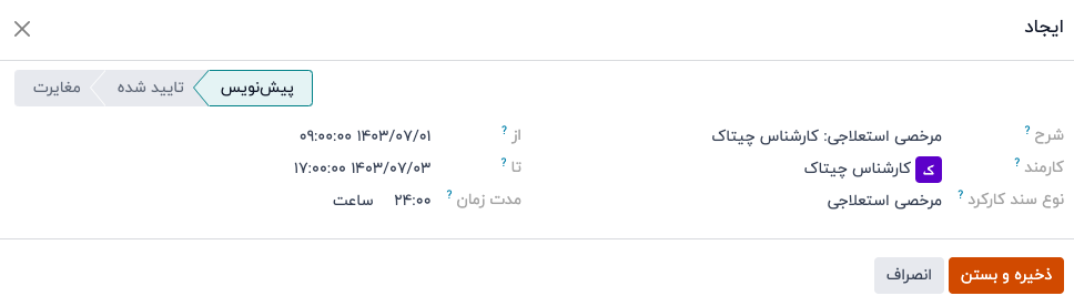 - شرح: یک توضیح کوتاه برای سند کارکرد وارد کنید، مانند مرخصی استعلاجی. اگر این فیلد خالی بماند، پس از انتخاب کارمند به طور خودکار پر میشود.