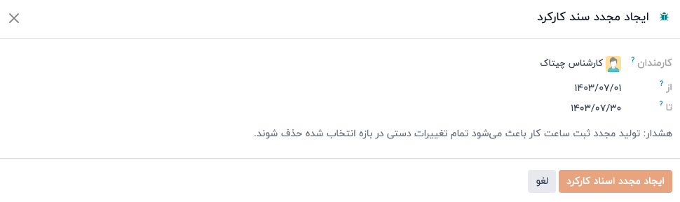 در پنجره پاپآپ، اطلاعاتی مانند توضیحات، کارمند و نوع سند کارکرد نمایش داده میشود. در قسمت پایین، محدوده تاریخ و زمان (از و تا) و همچنین زمان کل (به ساعت) در فیلد مدت نمایش داده میشود.