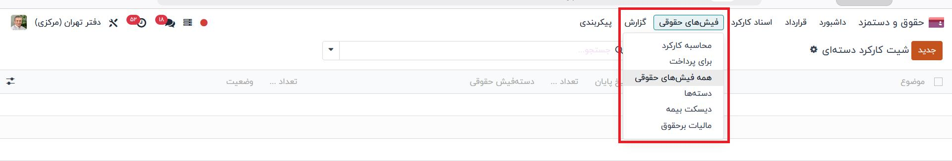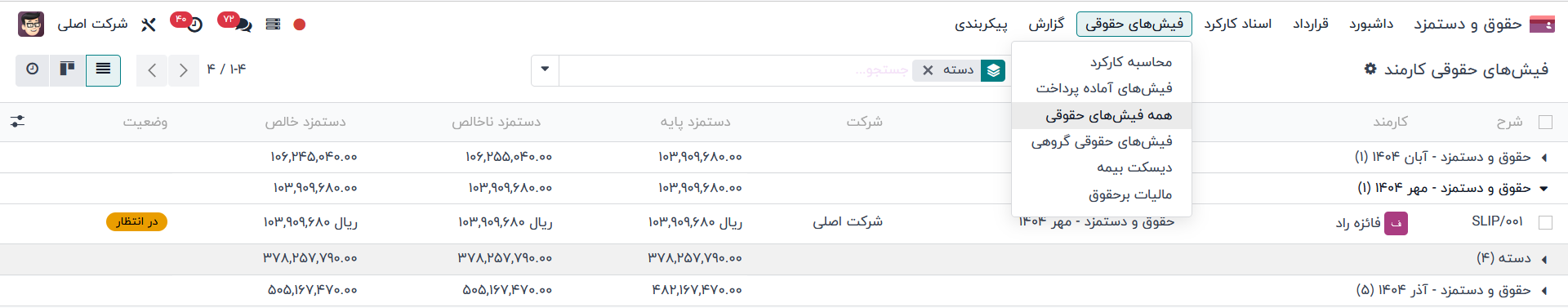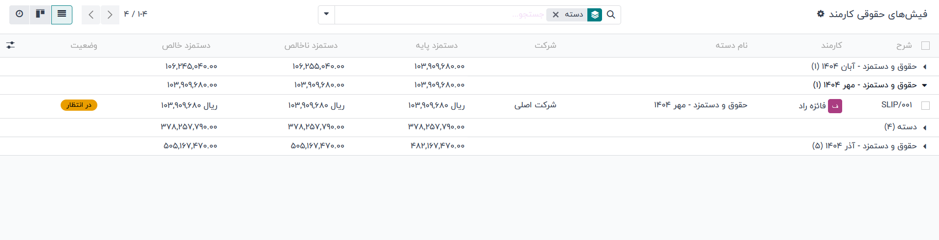 برای مشاهده فیشهای حقوق در گروهها، به برنامه حقوق و دستمزد ‣ فیشهای حقوق ‣ همه ی فیشهای حقوقی بروید تا تمام دسته های فیش حقوقی که ایجاد شدهاند نمایش داده شود. این دسته های فیش حقوق بهطور پیشفرض در نمای فهرست نمایش داده میشوند.