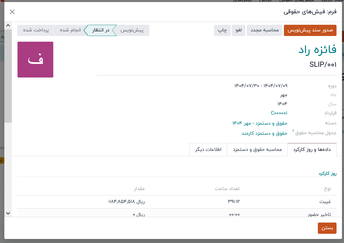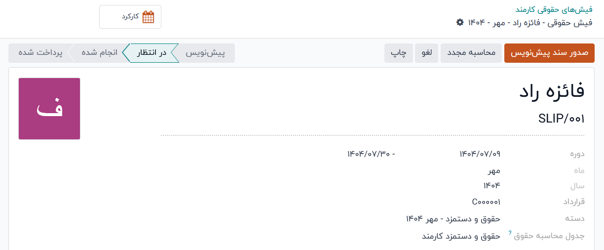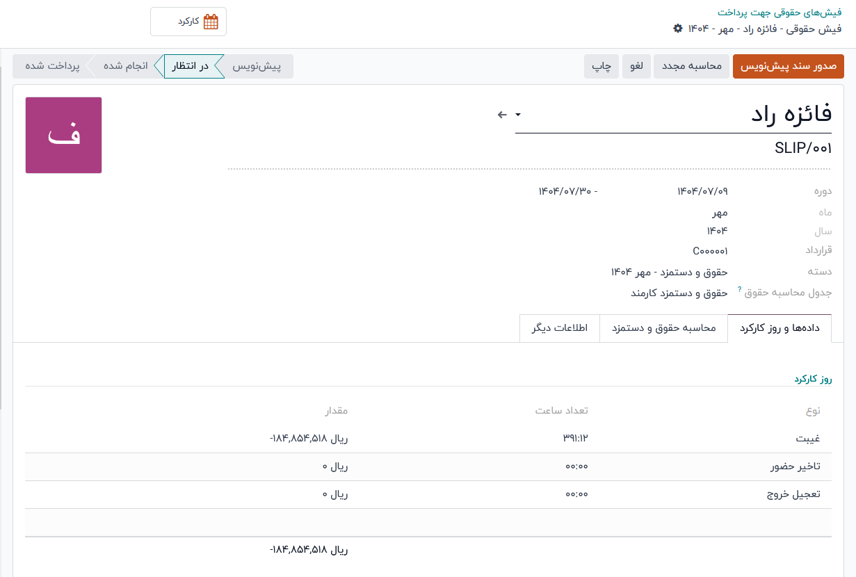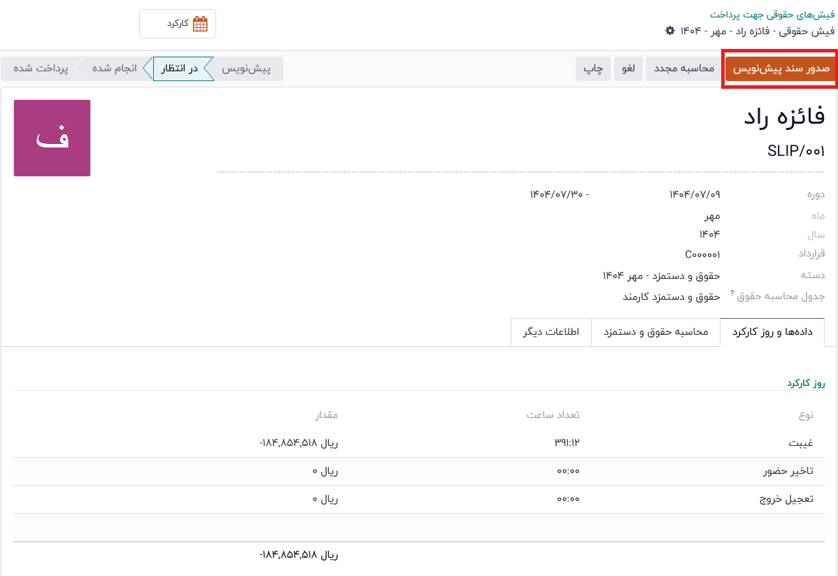 پیشنویس: فیش حقوق ایجاد شده و هنوز زمان برای ویرایش وجود دارد، زیرا مقادیر محاسبه نشدهاند.