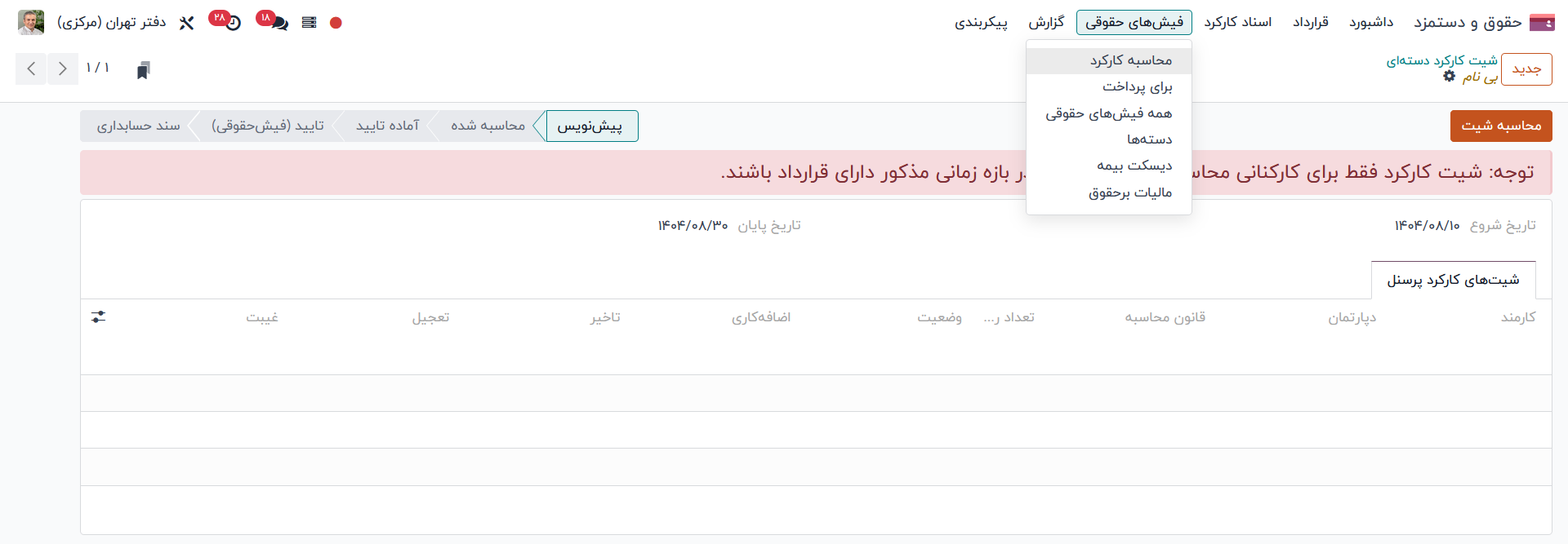 پس از انتخاب بازه مورد نظر و انتخاب گزینه محاسبه شیت، شیت آن ماه به صورت سیستمی برای کارمندانی که قرار داد فعال داشته باشند قابل مشاهده است.
