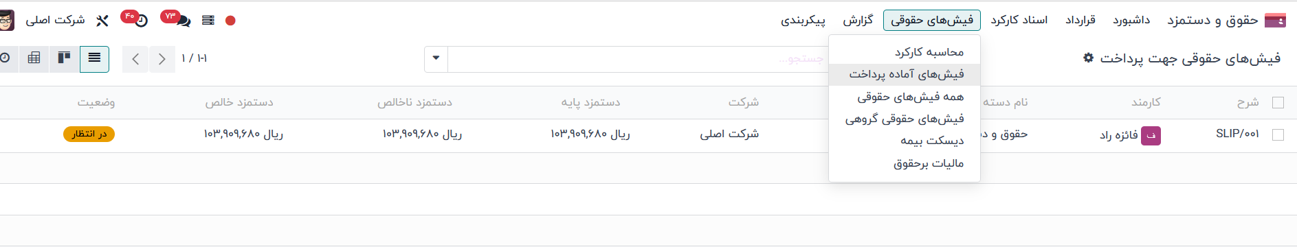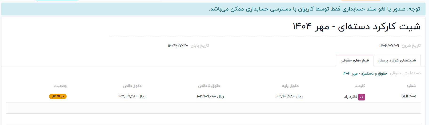 در انتظار: فیش حقوق محاسبه شده و جزئیات حقوق در زبانه محاسبه حقوق موجود است.