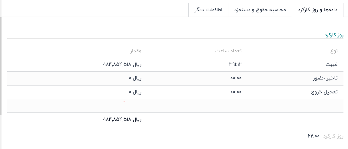 زمانی که تمام اطلاعات لازم در فیش حقوق وارد شد، بر روی دکمه محاسبه برگه کلیک کنید. با این کار، تمام اطلاعات فیش حقوق ذخیره شده و زبانه محاسبه حقوق بهطور خودکار پر میشود، بر اساس اطلاعات قرارداد یا سوابق حضور کارمند.