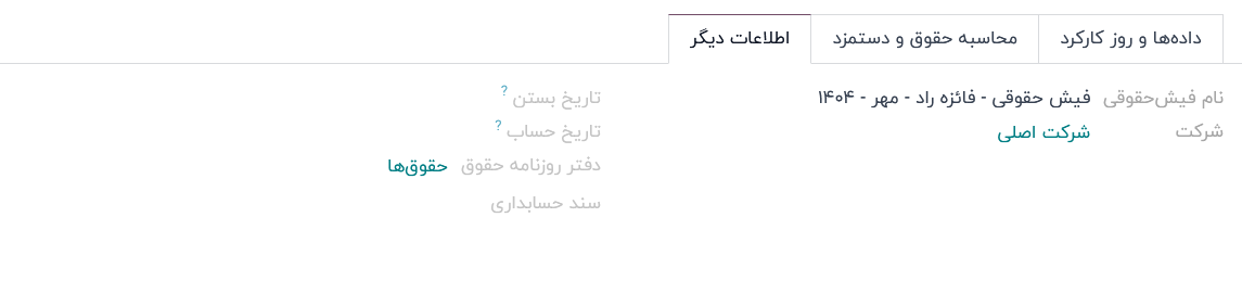 سند حسابداری: در صورت نیاز، این فیلد پس از تأیید فیش حقوق بهطور خودکار پر میشود. این فیلد قابل تغییر نیست.