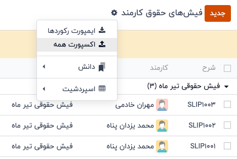فیشهای حقوق همچنین میتوانند به یک اسپردشیت Excel صادر شوند. برای صادر کردن تمام فیشهای حقوق، بر روی آیکون ⚙️ (چرخدنده) در انتهای عبارت فیشهای حقوق کارمندان در گوشه بالا سمت راست کلیک کنید. این کار یک منوی کشویی نمایش میدهد. بر روی اکسپورت همه کلیک کنید تا تمام فیشهای حقوق به یک صفحهگسترده صادر شوند.