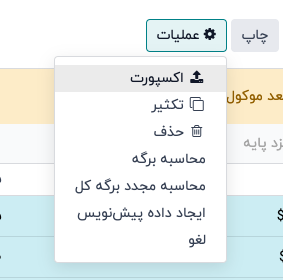 برای اکسپورت فقط فیشهای حقوق انتخابشده، ابتدا فیشهای حقوق مورد نظر را از لیست انتخاب کنید. با انتخاب فیشهای حقوق، یک دکمه هوشمند در مرکز بالای صفحه ظاهر میشود که تعداد فیشهای انتخابشده را نشان میدهد. سپس، بر روی آیکون ⚙️ (چرخدنده) در مرکز بالای صفحه کلیک کنید و گزینه اکسپورت را انتخاب کنید.