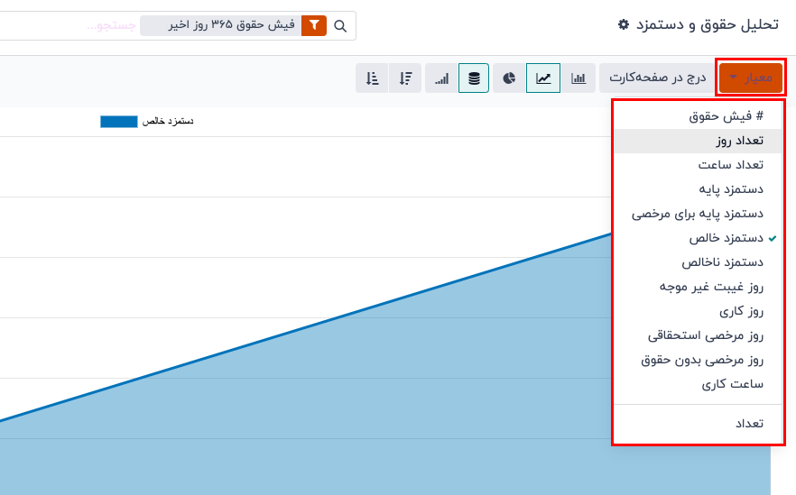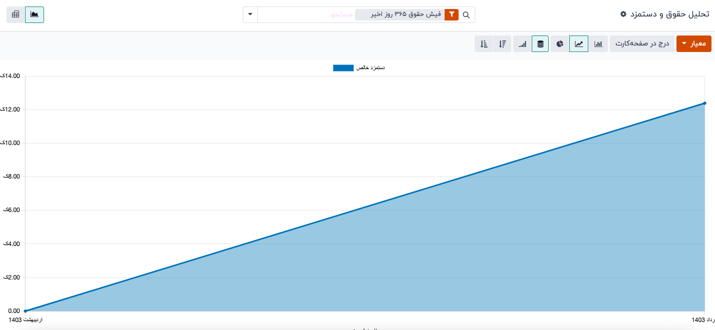نمودار خطی نمای پیشفرض برای گزارش حقوق و دستمزد است. اگر نمای دیگری انتخاب شده باشد، میتوانید با کلیک روی دکمه "نمودار خطی" (که با نماد 📈 (نمودار افزایشی) نمایش داده میشود) در نوار منو، نمای گزارش را به نمودار خطی تغییر دهید.