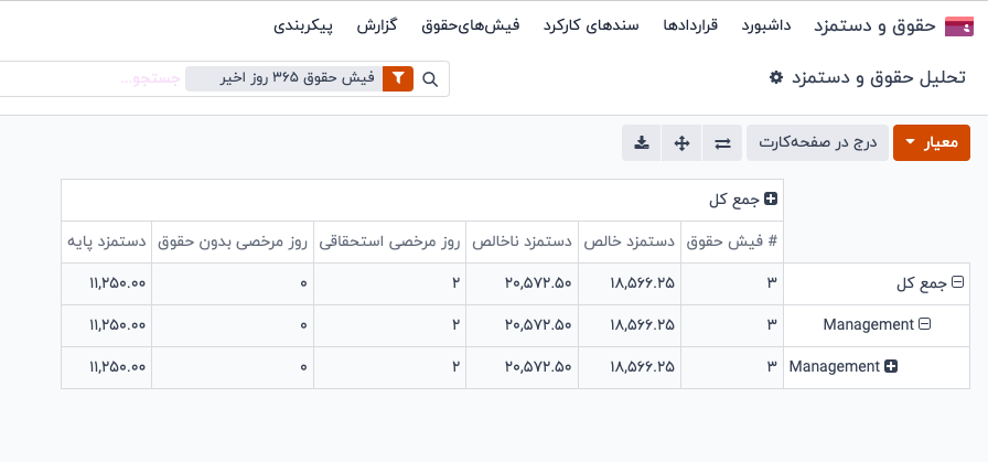 تا گزارش حقوق و دستمزد نمایش داده شود. این گزارش به دلیل فیلتر پیشفرض: "فیش حقوقی 365 روز گذشته" تمام فیشهای حقوقی که در 365 روز گذشته ایجاد شدهاند را نشان میدهد.