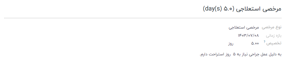 - نوع مرخصی: از منوی کشویی، نوع مرخصیای که درخواست تخصیص آن داده میشود را انتخاب کنید. پس از انتخاب، عنوان فرم با نوع مرخصی انتخاب شده بهروز میشود.