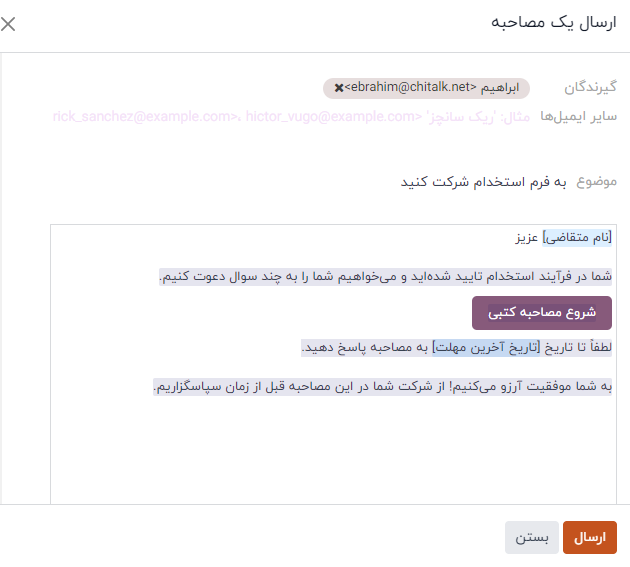 اگر در کارت متقاضی یک آدرس ایمیل ثبت شده باشد، یک پنجره پاپآپ "ارسال مصاحبه" ظاهر میشود که شامل گیرندگان، موضوع و متن ایمیل بهطور پیشفرض پر شده است.