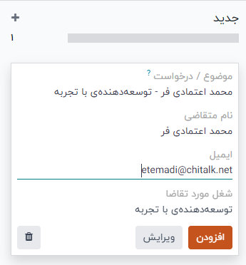 در صورت تمایل، پس از وارد کردن نام متقاضی در کارت کانبان ظاهرشده، روی ویرایش کلیک کنید تا فرم متقاضی با جزئیات کامل بارگذاری شود.