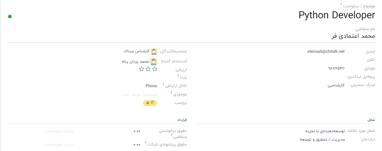 در فرم متقاضی جدید، فیلد موضوع/درخواست بهطور پیشفرض با موقعیت شغلی از پیش انتخابشده تکمیل میشود. ممکن است برخی از فیلدهای دیگر در کارت متقاضی نیز بسته به نحوه پیکربندی موقعیت شغلی، از پیش تکمیل شوند. معمولاً بخش شغل و همچنین فیلد مسئول جذب از پیش تکمیل میشوند.