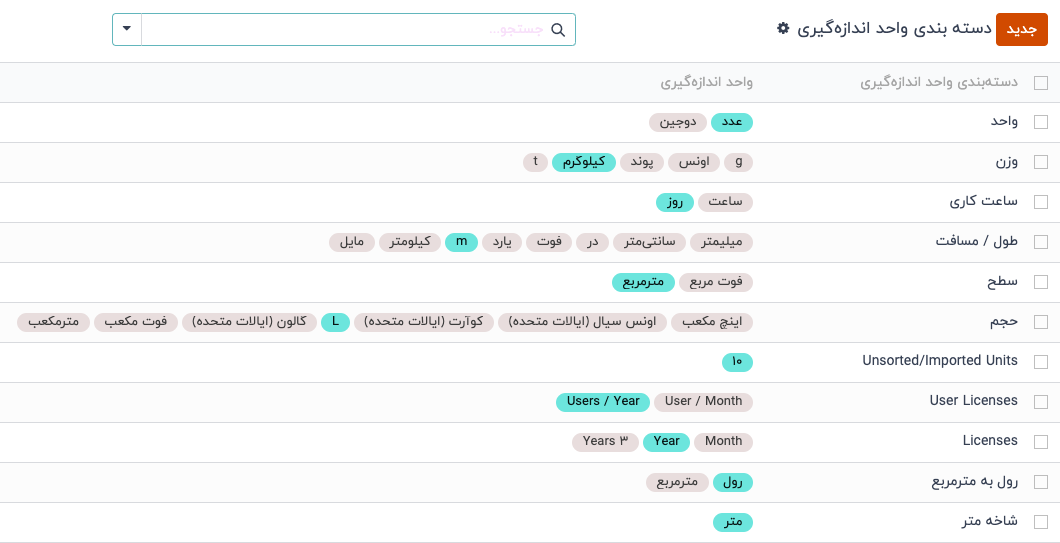 پس از فعالسازی "واحدهای اندازهگیری"، میتوانید دستهبندیهای پیشفرض واحدهای اندازهگیری را در مسیر زیر مشاهده کنید: