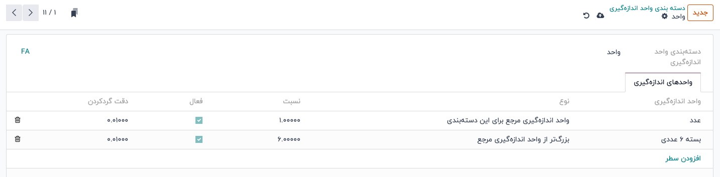 برای ایجاد یک واحد اندازه گیری جدید، ابتدا دسته مناسب را از صفحه دستهبندیهای واحدهای اندازهگیری انتخاب کنید. به عنوان مثال، برای فروش یک محصول در یک بسته ششتایی، بر روی خط دسته "واحد" کلیک کنید. سپس، در صفحه دسته که ظاهر میشود، بر روی "افزودن یک خط" در تب واحدهای اندازهگیری کلیک کنید. در فیلد "واحد اندازهگیری"، عنوان واحد جدید را وارد کنید، مانند "بسته ششتایی"، سپس در فیلد "نوع"، اندازه مرجع مناسب را انتخاب کنید، مانند "بزرگتر از واحد اندازهگیری مرجع".