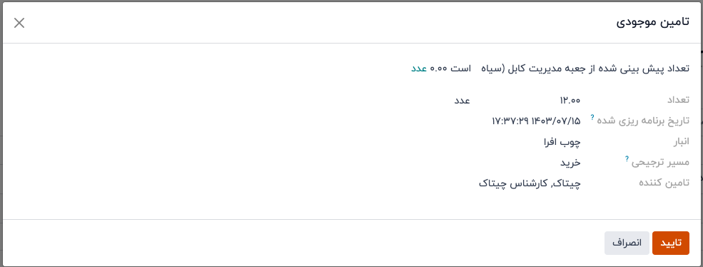 پس از کلیک بر روی تامین مجدد، یک کادر دستیار تامین مجدد باز میشود. در صورت لزوم، واحد اندازهگیری خرید را میتوان بهصورت دستی در فیلد مقدار ویرایش کرد. سپس، بر روی تایید کلیک کنید تا RFQ ایجاد شود.