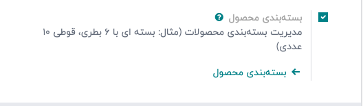فیلد بسته بندی محصول در فرم بسته بندی فقط با فعالسازی ویژگی بسته بندی محصول (انبار ‣ پیکربندی ‣ تنظیمات) قابل مشاهده است.