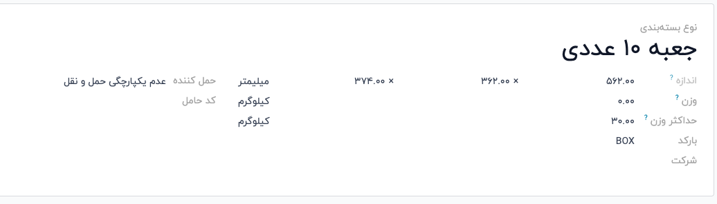 - نوع بسته: برای پیکربندی جعبههای حمل و نقل به منظور ارسال به مشتری استفاده میشود.