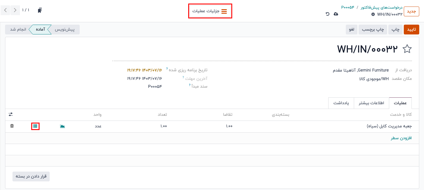 رای اختصاص یک شماره سریال به یک محصول، روی دکمه هوشمند جزئیات عملیات در رسید کلیک کنید.