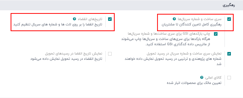 برای فعالسازی استفاده از تاریخهای انقضا، به مسیر برنامه انبار ‣ پیکربندی ‣ تنظیمات بروید و به بخش رهگیری اسکرول کنید. سپس، کادر سری ساخت و شمارههای سریال را فعال کنید.