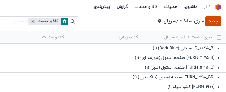 برای مشاهده (یا گروهبندی) تمام محصولات با تاریخ انقضا بر اساس شماره سری ساخت، به برنامه انبار ‣ کالا و خدمات ‣ شمارههای سری ساخت/سریال بروید.