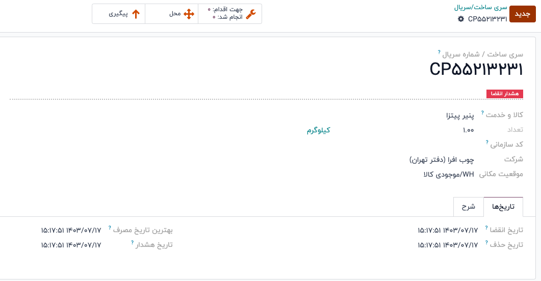 - تاریخ هشدار: تعداد روزهایی قبل از تاریخ انقضا که باید یک هشدار برای کالاهای موجود در یک سری ساخت خاص یا دارای شماره سریال خاص ایجاد شود.
