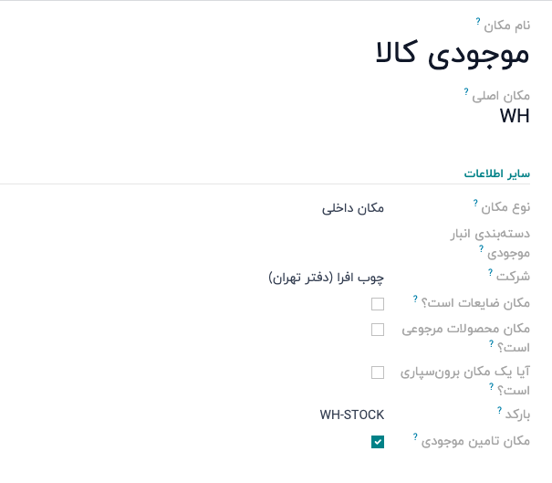 نوع مکان: از منوی کشویی، مکان تأمینکننده، نمایه، مکان داخلی، مکان مشتری، خسارت موجودی، تولید یا مکان ترانزیت را برای دستهبندی مکان انتخاب کنید. برای جزئیات در مورد هر نوع مکان، به بخش انواع مکانها مراجعه کنید.