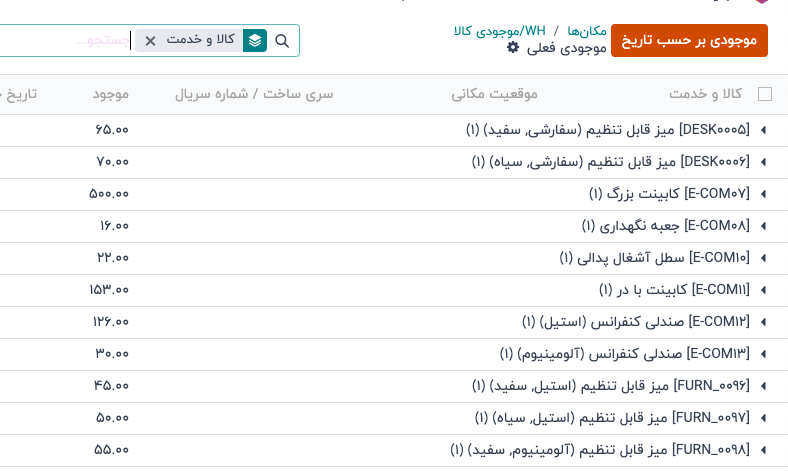 برای مشاهده موجودی فعلی در یک مکان واحد، به برنامه انبار ‣ پیکربندی ‣ مکانها بروید و مکان مورد نظر را انتخاب کنید.