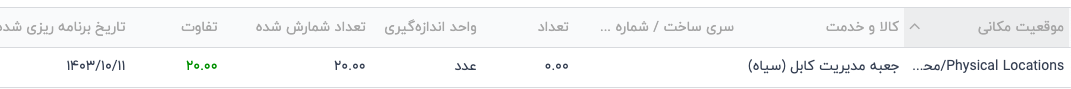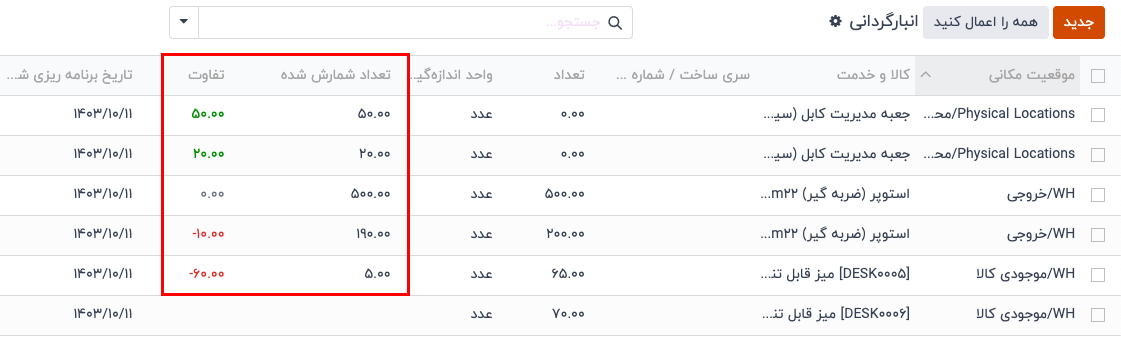 اگر تعداد شمارششده بیشتر از تعداد در دسترس باشد، مقدار ستون تفاوت به رنگ سبز است. اگر تعداد شمارششده کمتر از تعداد در دسترس باشد، مقدار ستون تفاوت به رنگ قرمز است. اگر مقادیر مطابقت داشته باشند و هیچ تغییری نداشته باشند، هیچ مقداری در ستون تفاوت ظاهر نمیشود.