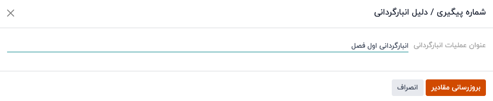 از این منوی پاپآپ، شماره پیگیری / دلیل انبارگردانی اختصاص داد. بهطور پیشفرض، فیلد عنوان انبارگردانی با عنوان پیشفرض پر شده است، اما میتوان آن را تغییر داد تا هر دلیلی که مورد نظر است را نمایش دهد.