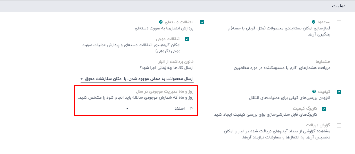 برای تغییر تاریخ برنامهریزیشده پیشفرض، به برنامه انبار ‣ پیکربندی ‣ تنظیمات بروید. سپس در بخش عملیات، تنظیم "روز و ماه انبارگردانی سالانه" را پیدا کنید که بهطور پیشفرض در منوی کشویی روی ۲۹ اسفند تنظیم شده است.