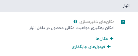 برای فعالسازی این ویژگی، به برنامه انبار ‣ پیکربندی ‣ تنظیمات بروید و به بخش انبار اسکرول کنید. سپس چکباکس کنار "مکانهای انبار" را علامت بزنید و روی "ذخیره" کلیک کنید.