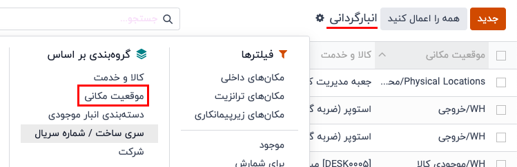 از منوی کشویی، بر روی موقعیت مکانی کلیک کنید. با این کار، محصولات به مکانهای ذخیرهسازی خود در صفحه تنظیمات انبار مرتب میشوند و میتوان یک شمارش دورهای برای تمام محصولات در آن مکان انجام داد.