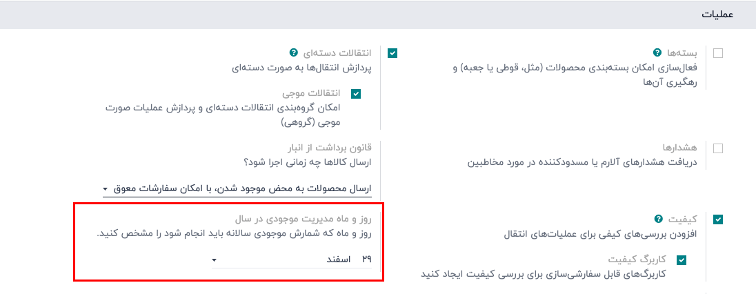 برای تغییر تاریخ برنامهریزی شده پیشفرض، به برنامه انبار ‣ پیکربندی ‣ تنظیمات بروید. سپس، در بخش عملیات، فیلد تنظیمات روز و ماه موجودی در سال را پیدا کنید که شامل یک فیلد کشویی است که به طور پیشفرض بر روی ۲۹ اسفند تنظیم شده است.