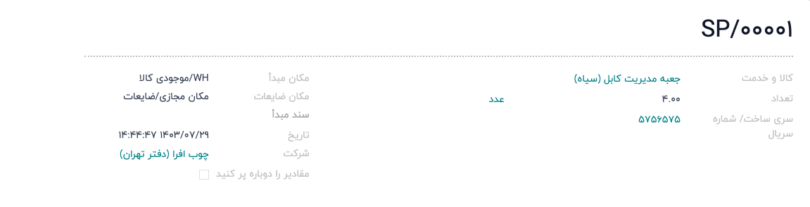 اگر کالای انتخابشده با استفاده از سری ساخت یا شماره سریال رهگیری میشود، فیلد "سری ساخت/شماره سریال" ظاهر خواهد شد. شماره رهگیری را در این فیلد مشخص کنید.