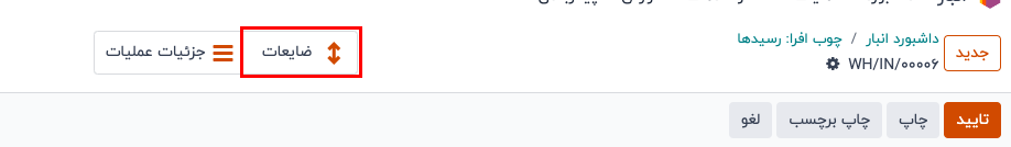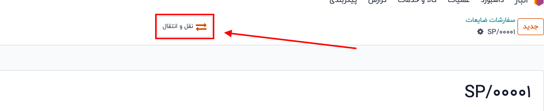 پس از آماده شدن، روی "تایید" کلیک کنید تا SP (ضایعات) جدید کامل شود. پس از تایید، دکمه هوشمند "نقل و انتقال" در بالای فرم ظاهر میشود. برای مشاهده جزئیات عملیات ضایعات، روی دکمه هوشمند کلیک کنید.